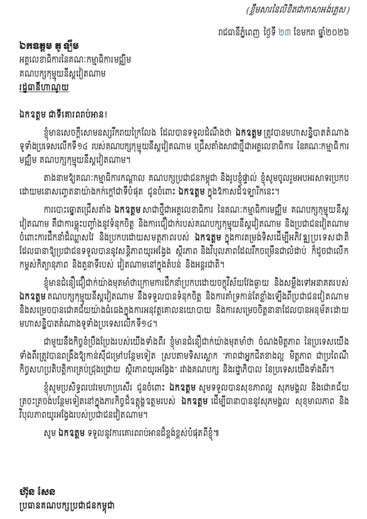ក្នុងសារលិខិតអបអរសាទរ ប្រធានគណបក្សប្រជាជនកម្ពុជា សម្ដេចតេជោ ហ៊ុន សែន ក៏បានបង្ហាញជំនឿជឿជាក់យ៉ាង មុតមាំថា ក្រោមការដឹកនាំប្រកបដោយចក្ខុវិស័យវែងឆ្ងាយ និងសម្លឹងទៅអនាគតរបស់លោក តូ ឡឹម បក្សកុម្មុយនីស្ត វៀតណាម នឹងទទួលបានទំនុកចិត្តនិងការគាំទ្រកាន់តែខ្លាំងឡើងពីប្រជាជនវៀតណាមនិងសម្រេចបានជោគជ័យយ៉ាងធំធេង ក្នុងការអនុវត្តគោលនយោបាយ និងការសម្រេចចិត្តនានាដែលបានអនុម័តដោយមហាសន្និបាតតំណាងទូទាំងប្រទេសលើកទី ១៤។ សម្រាប់ទំនាក់ទំនងរវាងប្រទេសជិតខាងទាំងពីរ សម្ដេចតេជោ ហ៊ុន សែន បង្ហាញក្ដីសង្ឃឺមថា៖ “ជាមួយនឹងកិច្ចខំប្រឹង ប្រែងរបស់យើងទាំងពីរ ខ្ញុំមានជំនឿជាក់យ៉ាងមុតមាំថា ចំណងមិត្តភាពនៃប្រទេសយើងទាំងពីរត្រូវបាន ពង្រឹងឱ្យកាន់តែ ស៊ីជម្រៅបន្ថែមទៀត ស្របតាមទិសស្លោក “ភាពជាអ្នកជិតខាងល្អ មិត្តភាពជាប្រពៃណី កិច្ចសហប្រតិបត្តិការគ្រប់ជ្រុងជ្រោយ ស្ថិរភាពយូរអង្វែង” រវាងគណបក្សនិងរដ្ឋាភិបាលនៃប្រទេសយើងទាំងពីរ”។