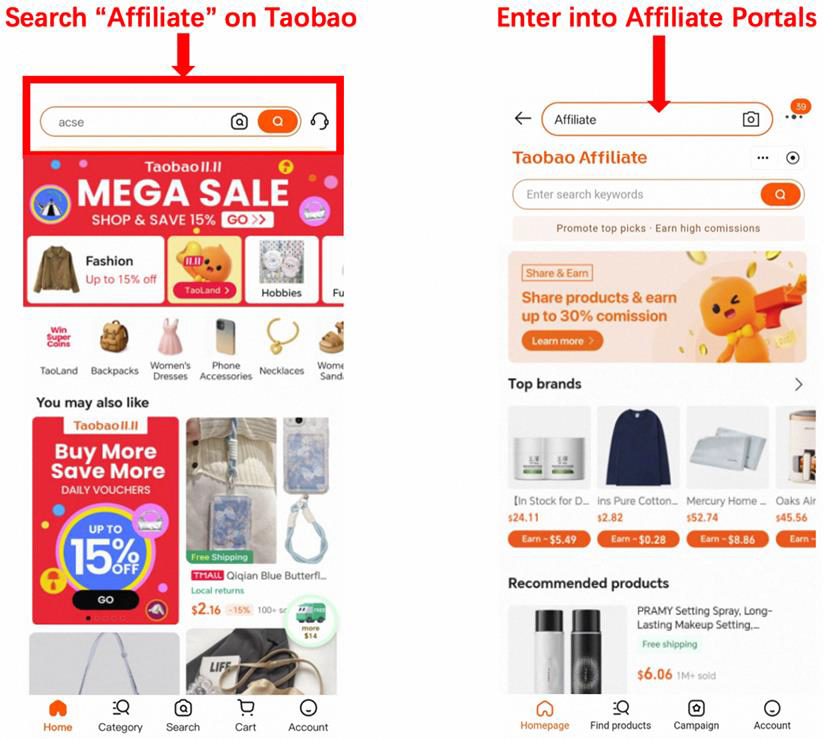 • The “Share & Earn” program, allows users to share products and earn up to 20% commission — including ¥0.1 for every new sign-up and ¥25 / USD 3.5 per product order. To participate, users simply need to type [AFFILIATE] in the Taobao search bar.